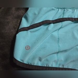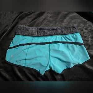 They are turquoise and black speed up high rise, lined shorts from Lululemon