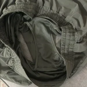 Experience ultimate comfort and performance with these green athletic shorts from Lululemon Athletica. Designed with a wide elastic waistband and a layered look, they feature built-in compression liners for added support. The lightweight material and short inseam make them perfect for running or training sessions.