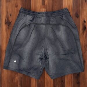 Keywords: Lululemon shorts, men's athletic shorts, running shorts, training shorts, workout shorts, gray shorts, patterned shorts, size L, athletic wear, men's activewear, gym shorts, drawstring shorts, zipper pocket shorts