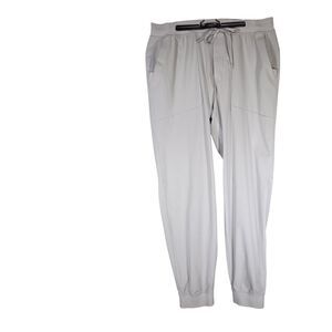 The Lululemon ABC Jogger Pants in Grey Silver Drop are designed for tall men in size XXL. These breathable pants feature a drawstring closure, tapered leg style, and a compression area at the waist for a comfortable fit. Made from blended fabric with a warpstreme material, these activewear pants are suitable for all seasons and have a solid gray color. The athletic fit and supportive features make them ideal for walking and other active pursuits, reflecting the brand's theme of performance and active lifestyle. Waist: 35", Inseam: 32", Rise: 13"