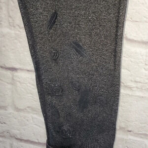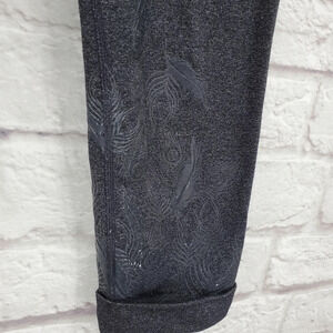 Details: Acro crop with silicone peacock graphic. Silicone graphic grips to your skin. Heathered charcoal with cuffed hem. Waistband pocket. The size tag has been removed but there is a size dot in the pocket. Dark Grey and Black With Silicone Embossed peacock Feathers and the iconic Lululemon symbol hidden in design