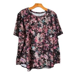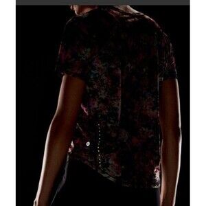 This is a Lululemon activewear top designed for running, training, and sports activities. The top features a vibrant stencil red multicolor pattern on a lycra fabric, with a crew neckline and short sleeves for a comfortable fit. It is a one size fits all garment with a regular fit, suitable for women. The top is lightweight, breathable, moisture-wicking, and stretchy, making it ideal for all seasons and intense workouts like running and crossfit. Additionally, it has reflective elements for visibility in low-light conditions.