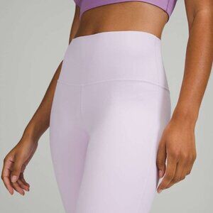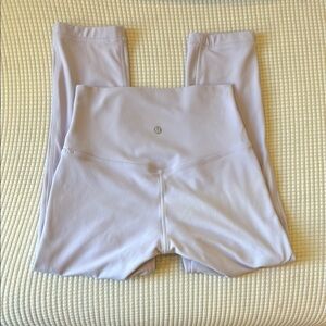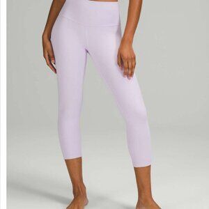 These Lululemon Align Crop 21" leggings in a gorgeous lavender/pastel purple are perfect for yoga, lounging, or light activities. Made with buttery-soft Nulu fabric, they offer a second-skin feel with a flattering high-rise waistband and minimal seams for ultimate comfort.