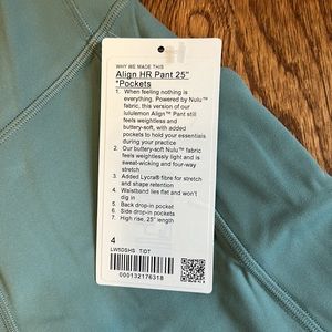 Lululemon Align pants with pockets. Size 4. 25” inseam. Tidewater teal color. New with tags.