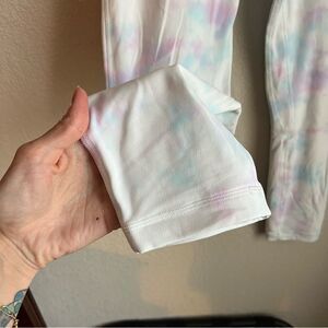 White base with pink and blue tie-dye throughout. Double-lined so nice and thick. 25” inseam. Very gently used condition, no flaws!