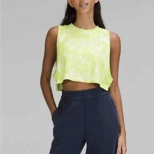 Brighten your workout or casual wardrobe with this bold Lululemon All Yours Crop Tank in a vibrant highlighter yellow tie-dye. Made from ultra-soft and breathable Pima cotton, it features a relaxed fit, cropped length, and exaggerated armholes—perfect for layering over your favorite sports bra. Each piece is uniquely dyed for a one-of-a-kind look.