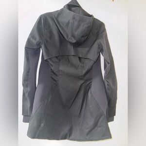 Sleek black jacket with full-zip design. Ideal for versatile wear. Best used as a rain jacket or to and from yoga class.