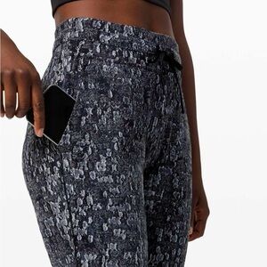 Experience the perfect blend of style and comfort with lululemon athletica's track pants. Crafted in a sophisticated black and gray palette, these joggers feature a luxurious texture that adds a touch of elegance to your casual wear. Designed for movement, they offer a comfortable fit ideal for both active and relaxed settings. In good Preloved condition.