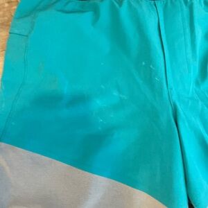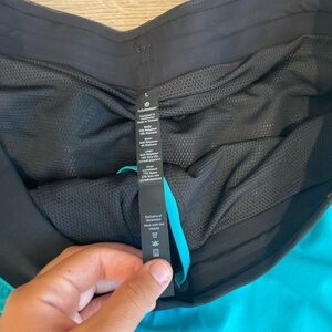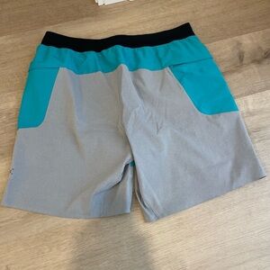 Stylish Lululemon shorts with a black waistband. Vibrant turquoise body. Perfect for active wear.