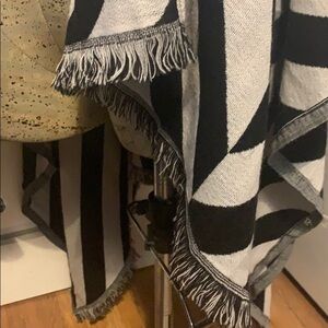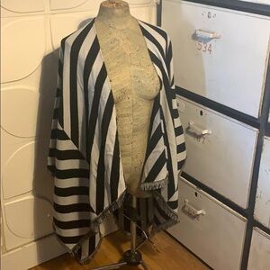 Stylish black and white striped tunic. Draped design with fringe details. Perfect for layering.
