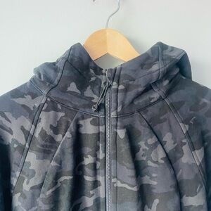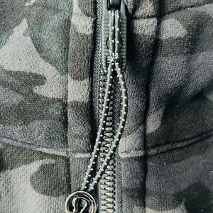 Stylish camo scuba hoodie by Lululemon Athletica. Features a full zip and hood. Perfect for casual wear. Lululemon logo embroidered on hood.