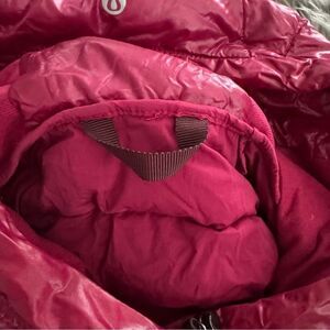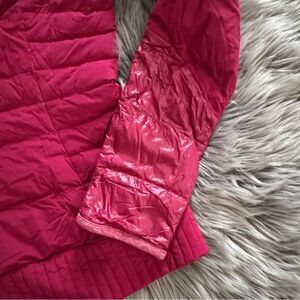 Stay cozy and stylish with this vibrant pink puffer jacket from Lululemon Athletica. Crafted from a shiny, quilted material, it offers excellent insulation with its warm, puffy design. The attached hood adds extra protection against the elements, making it a perfect choice for chilly days.