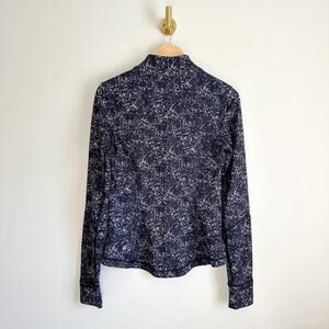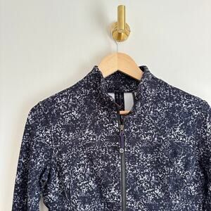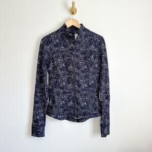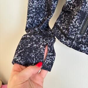 Details: Lululemon Athletica Forme Zip Up Mock Neck Activewear Jacket - Size: 6- Color: Black (Rocky Road Sand Dune Toothpaste)- Material: Luon - Features: Sweat-wicking, four-way stretch, breathable, cozy cuffins finger cover, dropped hem, zipper pocket, thumbholes, logo, zipper closure, mock neck, long sleeve, slim fit, hip length, comfort, casual, yoga, activewear.