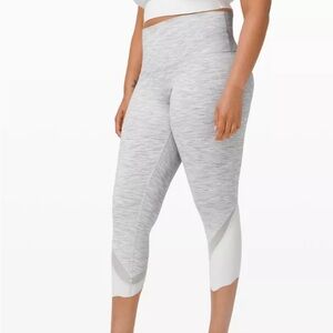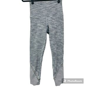 Experience ultimate comfort and style with these gray leggings from Lululemon Athletica. Crafted from a stretchy performance fabric, they feature a modern heathered texture and a sleek white panel at the lower calf for a sporty look. Perfect for workouts or casual outings, these form-fitting leggings offer a flexible fit and a contemporary aesthetic.