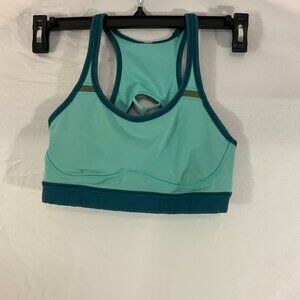 Racerback sports bra with unique, interwoven design in back. No cup paddiing, tiny spotting on left breast area.