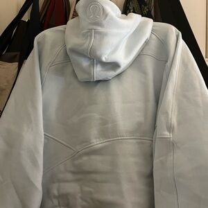 Cozy light blue hoodie. Features front pocket and half-zip design. Perfect for casual wear.
