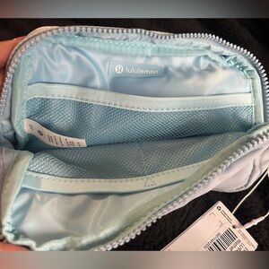 Sleek light blue pouch with logo accent. Ideal for carrying small items.