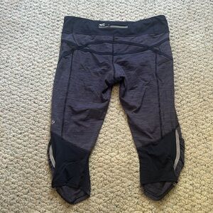 Lululemon navy blue and purple striped Capri length leggings with a secure zip pocket on back, mesh on calves. Used condition; price reflects wear.