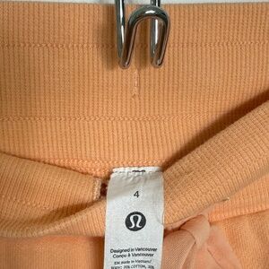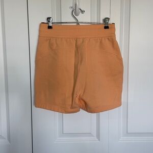 These Lululemon Athletica Orange High-Rise Scuba shorts are extremely comfortable! They are in great condition and feature two side pockets and an adjustable waistband. Official color name is Peach Bellini.