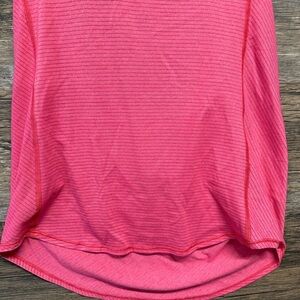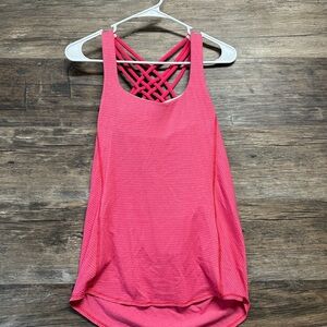 This eye-catching pink tank top from Lululemon Athletica boasts a unique backless design with intricate criss-crossing straps, perfect for adding flair to your workout or casual ensemble. Its sleeveless style and lightweight fabric ensure comfort and ease of movement.