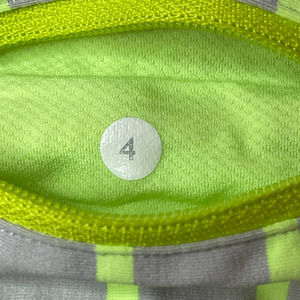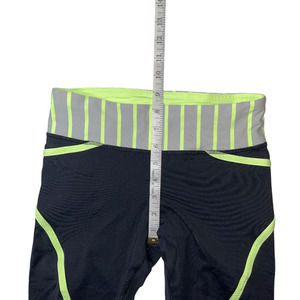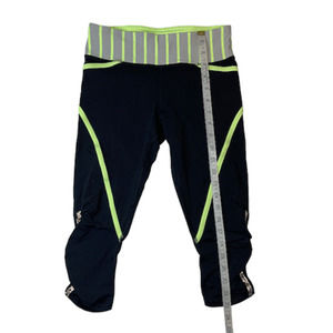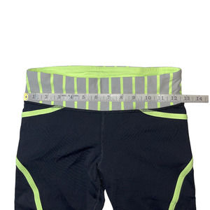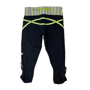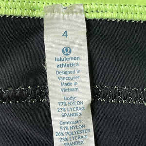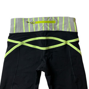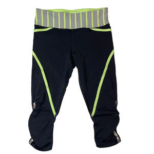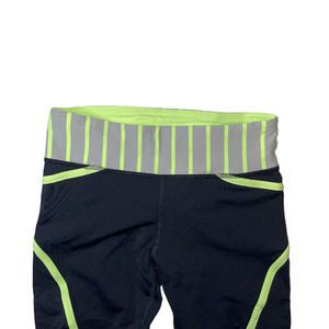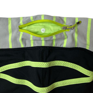These Lululemon capri's feature a black cari style legging with grey ad neon yellowish green accent, Gray and yellowish green striped waistband, two interior pockets, one zip close pocket on back of waistband, and quick dry wicking fabric. Size 4