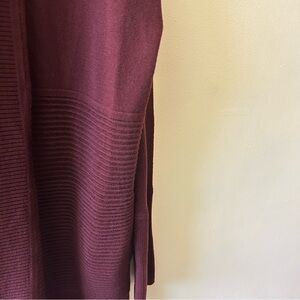 Lululemon Athletica Sit in Lotus wrap II merino wool cardigan. Black cherry color, open front, slightly oversized, split back, pockets, thumbholes