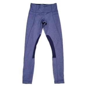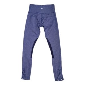 Lululemon Athletica high waist crop leggings with snap ankles and waistband media pocket. Heather blue color with dark blue inner thigh patch detail.