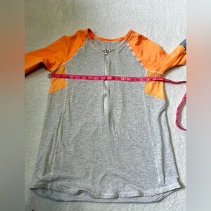 Lululemon Athletica branded Spin City style ¾ sleeve top with a quarter/half zip closure, lightweight and breathable stretch fabric, mesh underarm fabrication, rounded neckline.