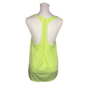 The Lululemon Athletica Tank Top in Neon Yellow is a stylish and versatile sleeveless top perfect for traveling or casual outings. Made from lightweight and breathable material, this tank features a solid color with a round neckline and pullover closure. The racerback style adds a sporty touch, while the branded logo accents personalize the look. Machine washable for easy care, this tank is a great option for the warmer seasons of summer, fall, and spring. Please see photos for measurements. Rip tag is missing from this item.