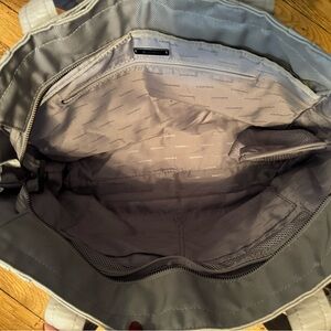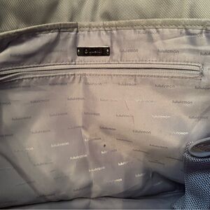 Well loved Lululemon bag that’s ready for a new home! Some markings on exterior and interior (as noted in photos) but still has a lot of life left! Dimensions noted in last photo. Light purple/gray color and functional bag for work and travel!