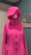 Bright pink ski jacket with hood. Sleek design for winter sports.