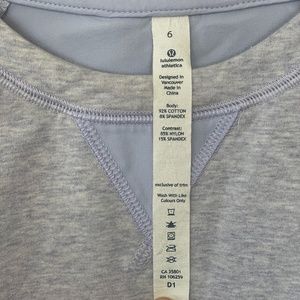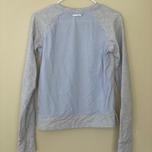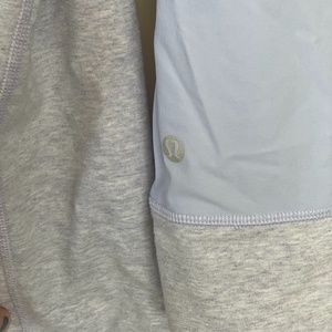 Lululemon Voyage Pullover in Heathered Gray and Lilac. Stretch French Terry pullover sweatshirt with moisture wicking yoga board short fabric back. Thumbholes in cuffs. Size 6. Approximate measurements: length: 22”, pit-to-pit: 18”. In excellent condition, no flaws. Reasonable offers welcome. No trades or modeling.