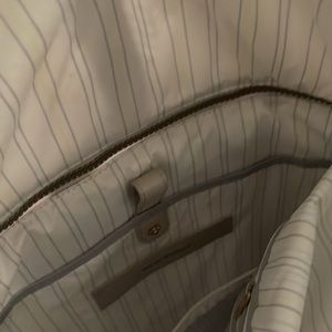 Stylish white backpack with gold accents. Features front pocket and secure zip closure. Perfect for everyday use.