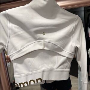 Stylish white bomber jacket. Features a sleek design with a front zipper. Ideal for layering.