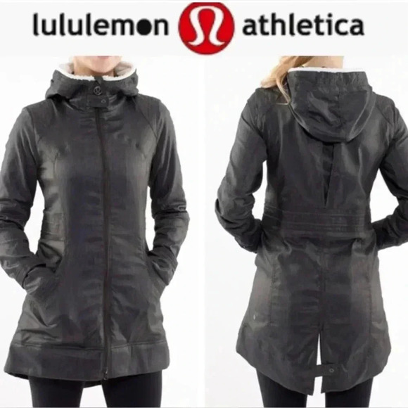 Keywords: Lululemon, parka, hooded, insulated, charcoal, gray, womens, athletic, casual, outdoor, winter, fall, sherpa lined, zip front