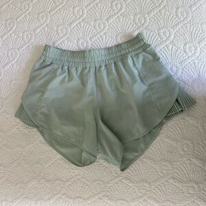 Light green athletic shorts with pleated sides. Elastic waistband for comfort. Ideal for workouts.