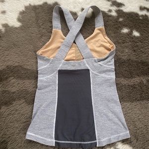 Grey and white stripe top with black mesh like panel on back side. Crisscross straps and an interior shelf bra. In very good pre-owned condition.