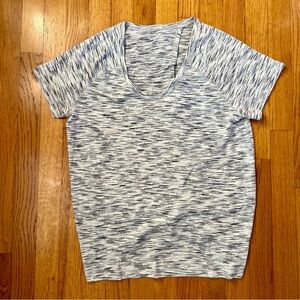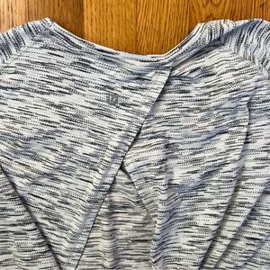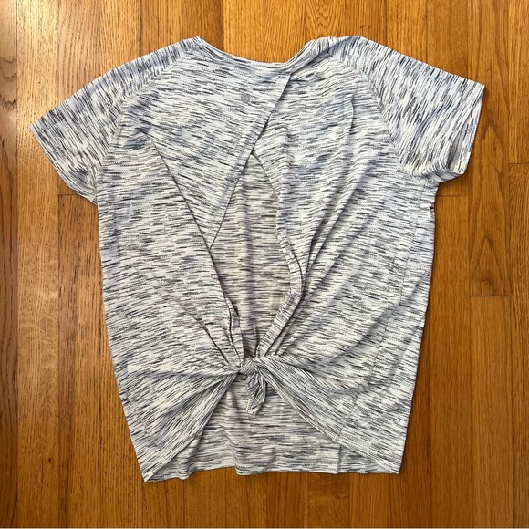 Details: Lululemon Back In Action Short Sleeve in Tiger Space Dye Black White. Info from lululemon-“Wear this lightweight anti-stink top two ways: tie the back to secure it to your body and keep it out of your way during your sweat session or let it hang loose. Made with Seriously Light™ Luon fabric that is the lightest version of our soft, sweat-wicking, four-way stretch Luon® fabric.