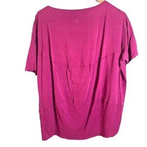 Lululemon Back in Action Short Sleeve Shirt in Magenta Purple. Size 12. Features short sleeve, boat neckline, scooped back hem, pima cotton fabric, and relaxed fit. Style W3DMLS. Light wear.