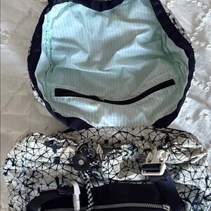 Stylish backpack with a geometric pattern. Features adjustable straps and multiple compartments. Many zippers. Comes with crossbody bag that may also be snapped to backpack. Nylon waterproof Zipper sleeve for laptop/ipad on back