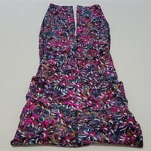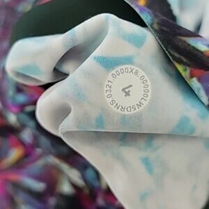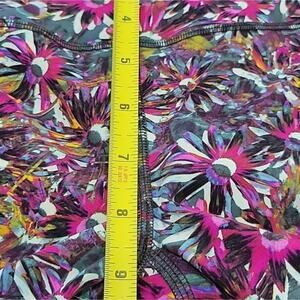 This article worn several times. floral electric multi in color. lightweight. feels cool and sleek. sweat wicking. back pocket. drawcord. 4 way stretch. nulux fabric. highrise
