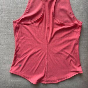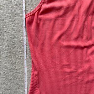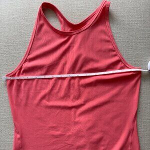 In excellent, like-new condition. Worn once/hung up to dry. This ribbed, high-neck tank is a bright coral color. Approx 15" pit to pit and 11.5" from pit to base.