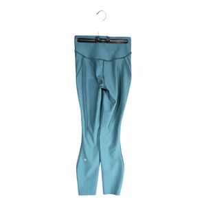 The Lululemon Base Pace High-Rise Tight 25" in Two-Tone Ribbed Green Jasper/Blue Chill is a stylish pair of leggings designed for activewear. Featuring a high-rise waist of 10.5", these leggings are in size 4 with a waist size of 24 inches. The fabric is a blended material with a medium wash, suitable for machine washing. The design includes micro stripes in a two-tone ribbed pattern, adding a unique touch to the blue color scheme. These ankle-length leggings with a logo accent are perfect for a workout or casual wear during the summer, fall, or spring seasons.