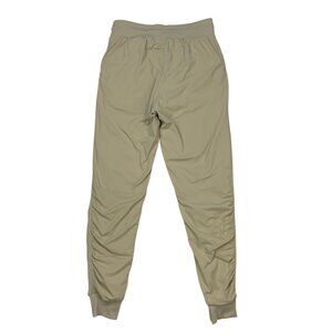 This Lululemon women's Beyond the Studio 7/8 Jogger makes a statement due to it's jogger style, lining, pull-on fit with drawstring, pockets, ruched/cinch detail, sweat wicking, ribbed trim, logo placement and light beige shade.
