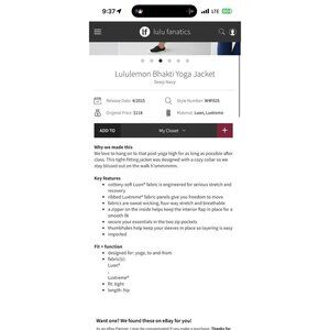 Lululemon Bhakti Yoga Jacket, Blue, Size 10 P12