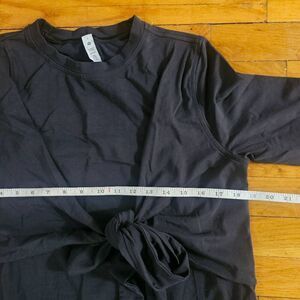 Lululemon black wrap-front T-shirt dress in size 8. The actual measurements of the garment are shown in the photos. Any defects are also shown in the photos. Please note that all clothing is unwashed and may have a slight odor.