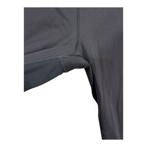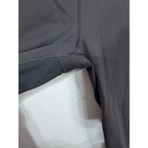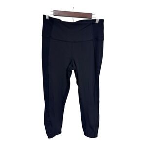 Lululemon cropped athletic leggings in sleek black with ruched hems and a supportive high-rise fit. Features a back zip pocket, wide waistband, and flat seams for comfort during workouts. Reflective logo at back. Size 12 confirmed by visible side dot. Excellent used condition with no flaws.