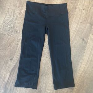Lululemon Black Crop Leggings Size 8. Crop leggings with split at the bottom near the calf. Piling on the leggings.