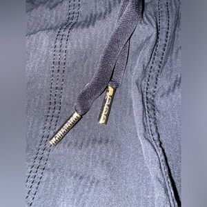 Lululemon Black Capri style studio pants. Super soft and comfy. With elastic waist and adjustable straps. Straps have metal ends with the word Lululemon. Two side pockets. Draw cord at bottom to make it as loose or tight as desire. Lululemon logo in front side. Size 10