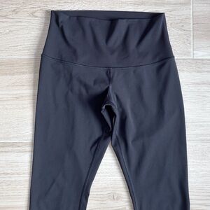 Lululemon Black Cropped High Waisted Leggings. Has a Lululemon logo on both the inside waistband and the outside waistband. Has sheer patch on the front of the legs.